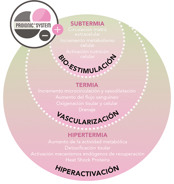 La interacción de esta radiofrecuencia llamada Sistema Proionic con los tejidos biológicos, provoca una adecuada movilización de estos iones y un incremento homogéneo de la temperatura, lo que permite a los tejidos recuperar su actividad óptima a través de tres efectos: